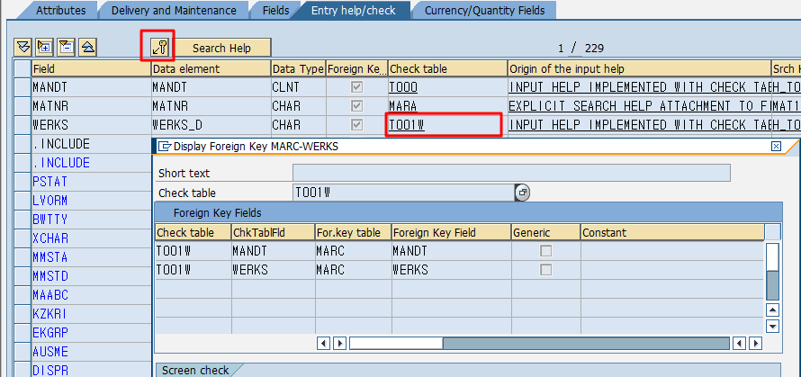 MARC 테이블의 Entry help/Check탭을 보자. 뭔가 써있는 행들이 많이 있다. MATNR필드 줄을 더블클릭해보면 테이블의 필드 속성에 관한 창이 나타난다.