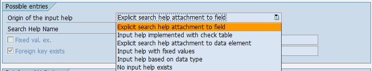 명시적으로 Search Help 필드를 설정하였을 경우에 나타난다. 아래의 그림을 보면 MATNR 필드에 Search Help버튼을 사용하여 MAT1이라는 Search Help를 할당했음을 알 수 있다.