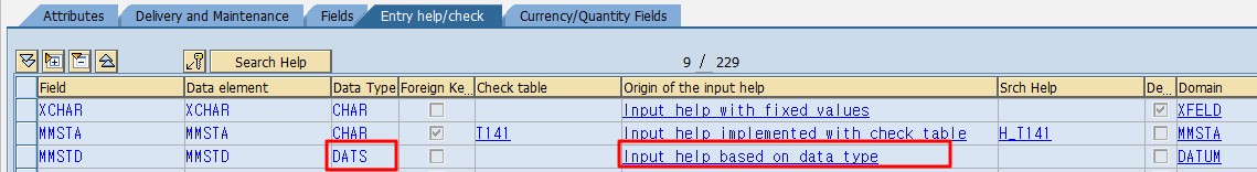 Date는 날짜를 선택하는 달력이 , Time은 시계가 나오게 하는 등의 기본 제공되는 Data Type 이 Search Help를 가진 경우 그것이 할당되어 보인다.
