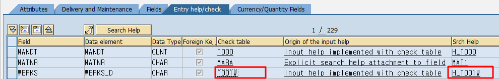 필드 WERKS에서 Foreign key 아이콘을 누르면 매핑한 Check Table을 볼 수 있다. Check Table을 가진 경우 H_ + CheckTable명으로 Search Help가 자동 생성되어 할당되어진다.