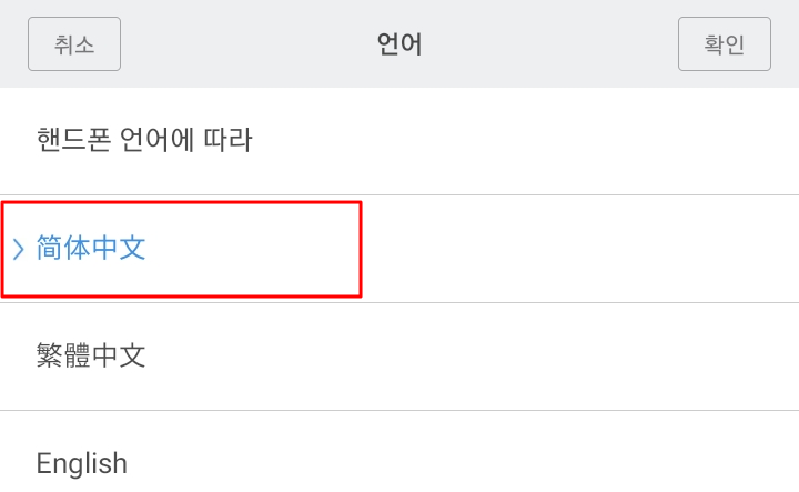 언어를 선택하려고 들어가면 한국어가 없다고 당황하지 마시고 두 번째 줄의 중국어를 선택합니다.