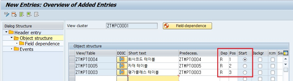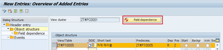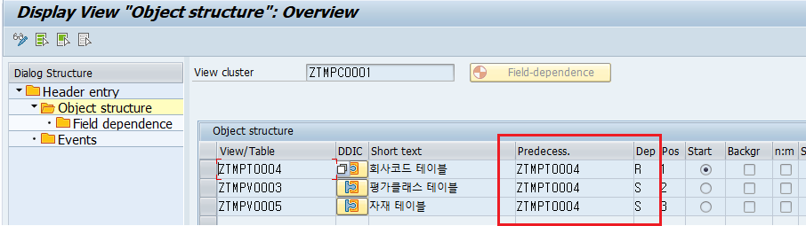 상위 테이블의 Predecess.(선행 테이블)는 기존 1) 번 생성할 때와 같으나 하위단의 뷰는 연결될 상위 테이블이나 뷰를 넣어주고 Dependence(필드 종속성)도 'S', 'M'을 세팅해야 합니다.