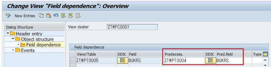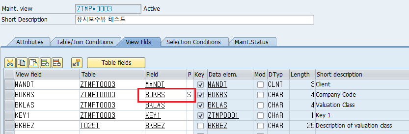 종속 Object 1: 회사코드(BUKRS)를 가진 유지보수 뷰 BUKRS필드는 유지보수 플래그를 'S'.
