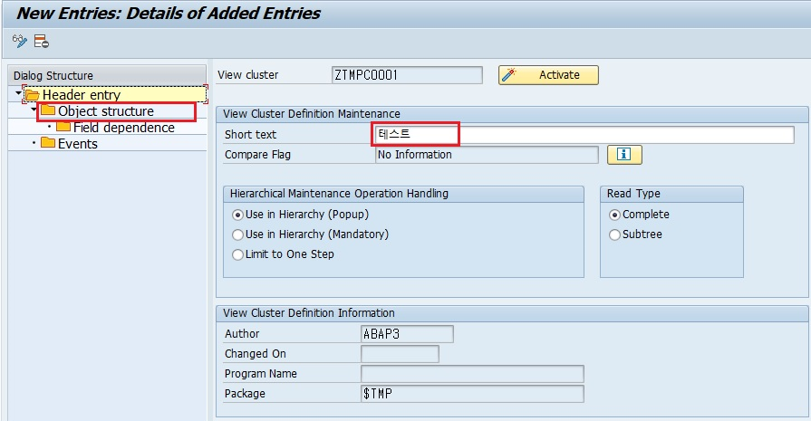 View Cluster명을 Short Text에 넣고 좌측의 Tree 구조 메뉴 중 Object structure를 눌러 다음을 진행합니다.