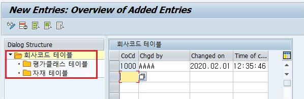 상단에 데이터 입력 저장 후 하단을 눌러보면 연결된 필드는 변경이 불가능하게 화면 상위에 필드 값으로 나오게 됩니다. 이는 유지보수 뷰를 만들 때 유지보수 플래그를 'S'로 하여 Maintenance Dialog를 생성한 결과입니다.