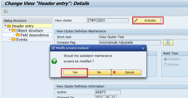 Header Detail 구조를 가진 View Cluster를 생성해 보겠습니다. 최상단에 BUKRS(회사코드)를 입력하면 하단의 테이블들은 상단의 값을 가지고 생성되며 상단의 입력값을 임의로 고칠 수 없게 하여 데이터 무결성이 강화되게 하는 방법이 될 수 있습니다.