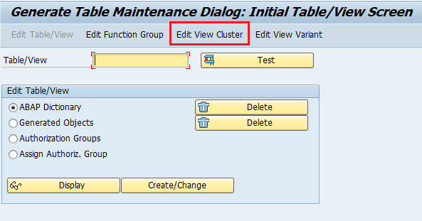 Maintenance Dialog를 생성하는 T-CODE SE54를 실행하고 상단의 Edit View Cluster 버튼을 누르면 View Cluster 관리 화면으로 넘어갑니다.
